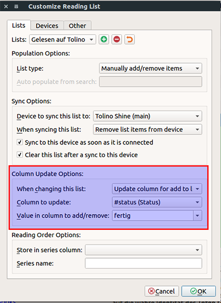I only reed on my Device, so I created a "Finish"-List, which remove books from the Device. (See Attachment) For books I read years ago before the use of Calibre, the Yes/No choice is all I needed. But now I want to track new finished books with a read_at date. So, if this is possible and not so much time to program, I wish to request for the field "Value in column to add/remove" the choice for a date field. =) The wish is, if I remove a book from the device, your plugin add the current date into a column. That would be awesome. Or is there an alternative? So if the Yes/No field update with your plugin, than my date field will automatically create the current date? Sorry for bad English, I'm not a native speaker xD Greetz and Thank you again, great plugin! |