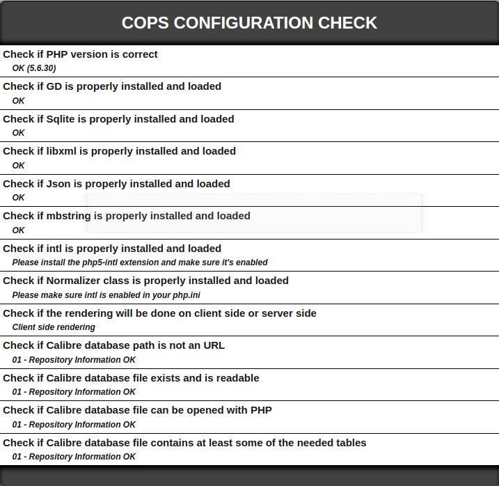 However, per the hints, I checked php.ini for any mention of "intl" or "Intl" and no hits. In previous setups I had installed Entware because it had the Intl php5 module. but I noticed that line in the check config screen never says OK, just to check Intl installed and activated. But I am holding off Entware to keep the system as clean as possible while trying to get this to work. So I don't know if Intl ever got loaded in php.ini or not, even with Entware. Could that be part of this problem? I also attached a txt file of the loaded apache modules. Not sure how to tell if they are available to the "QNAP Webserver", but the list shows ALL apache modules, according to the qnap guides. [Edit] Forgot to mention; I setup COPS111 normally using the default port 80, no Virtual Host for it until we get this sorted out...until everyone throws up their hands in despair, that is