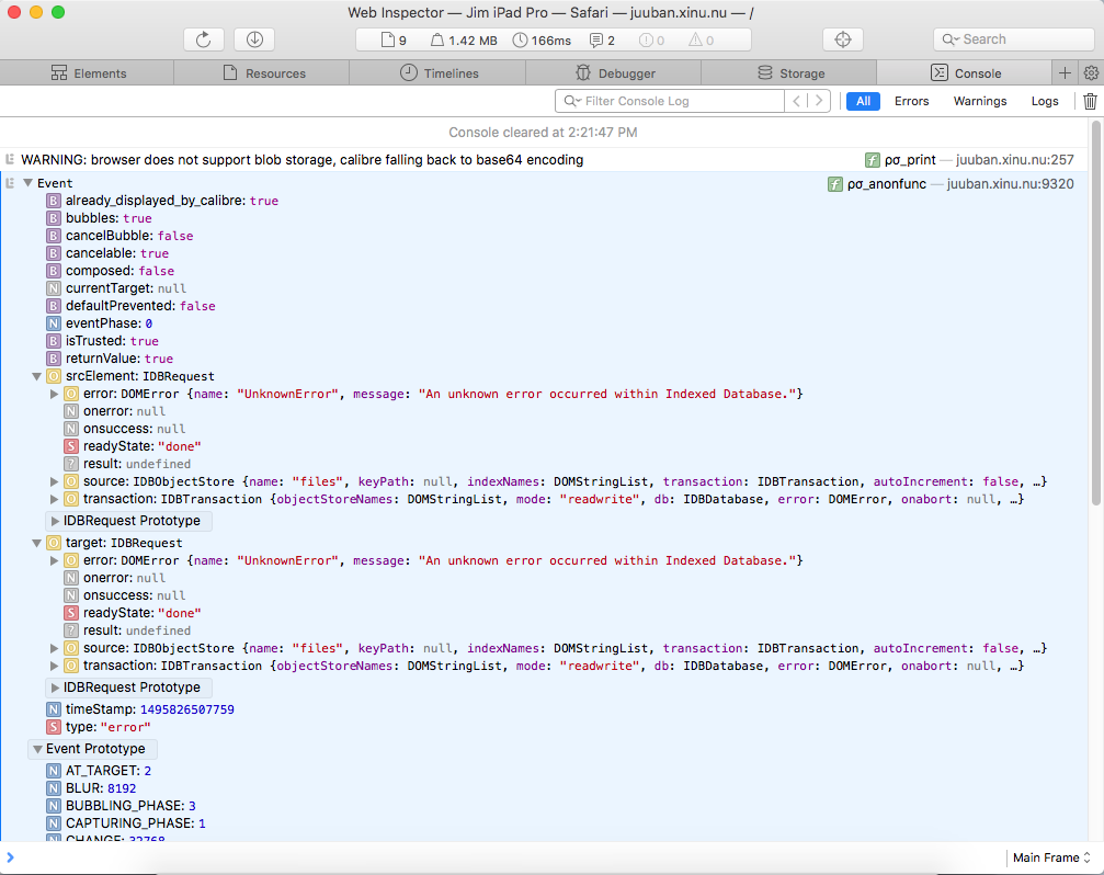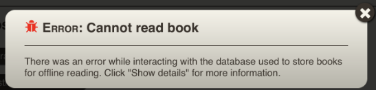 There is no second pop up with 'show details' to click. It took a bunch of retries before it started working, but I did get remote safari debugging working long enough to see the error in a console: After that, I can choose a library and browse the contents, switch to list view, view book details, download epub and open in iBooks. Attempting to read the book in browser gets a download screen, then the 'tap here' instructions, then the cover image is presented. Nothing I tap at that point (except browser back button) does anything. I don't see anything else appear in console. Chrome on iOS is very similar, except first I get: Followed by an identical "cannot read book" with no second pop up with 'show details' to click. The "unhandled error at :0" msg shows up more frequently in chrome (every page load? every click?). I can choose a library and browse the contents, switch to list view, view book details, download epub and open in iBooks. Albeit frequently dismissing the error boxes. Attempting to read in browser also goes to cover, but instead of tapping doing nothing, it pops the "unhandled error at :0" again each time. I did find some indexeddb demo pages that iOS Chrome and Safari worked with, so it does at least work sometimes... Let me know if there are specific tests I can try. |