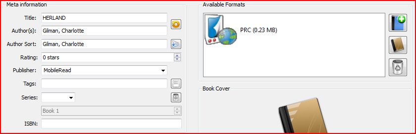 1. I imported the book into Calibre and made my meta data changes (herland2). As you can see, I made sure that both "Author" and "Author Sort" were entered as "lastname, firstname". I clicked okay. 2. Once back in the main window, I right clicked on the book title and chose "Convert E-books". Once I was in the convert window, I clicked the "page set-up" icon and for the "Destination Profile", I chose "Kindle" (herland6). I clicked okay and was sent back to the main window. 3. I watch the hour glass do it's dance for a few moments. I then went to my Calibre ebook directory and transferred the resulting .mobi file to my Kindle "documents" folder (herland7 - before and after). The title was changed and I was able to sort by author and have the book show up with the "G" authors. |