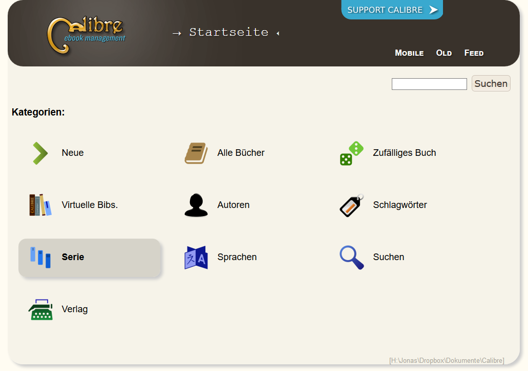 After I have chosen a library I see all my books (first screenshot). If I want to get to my series I have to click on the magnifier, choose the category "series" (second screenshot), then click on the first letter of the series (third screenshot) and then on the specific series I want to browse (fourth screenshot). Now (fifth screenshot) the books are being displayed but I can not return to the screen before. Instead, now I return to the start screen. So with this version it takes four clicks to see all books of a series (ignoring that you maybe have to select a library before the first step). And also I cannot use the go-back function of the browser. This does apply for all categories and not only series of course. Another thing I find sad to have disappeared are pages. I cannot skip some books during browsing by clicking on the third page when I am on the first one. Please let me hear what you think about this. Thank you for taking your time. |