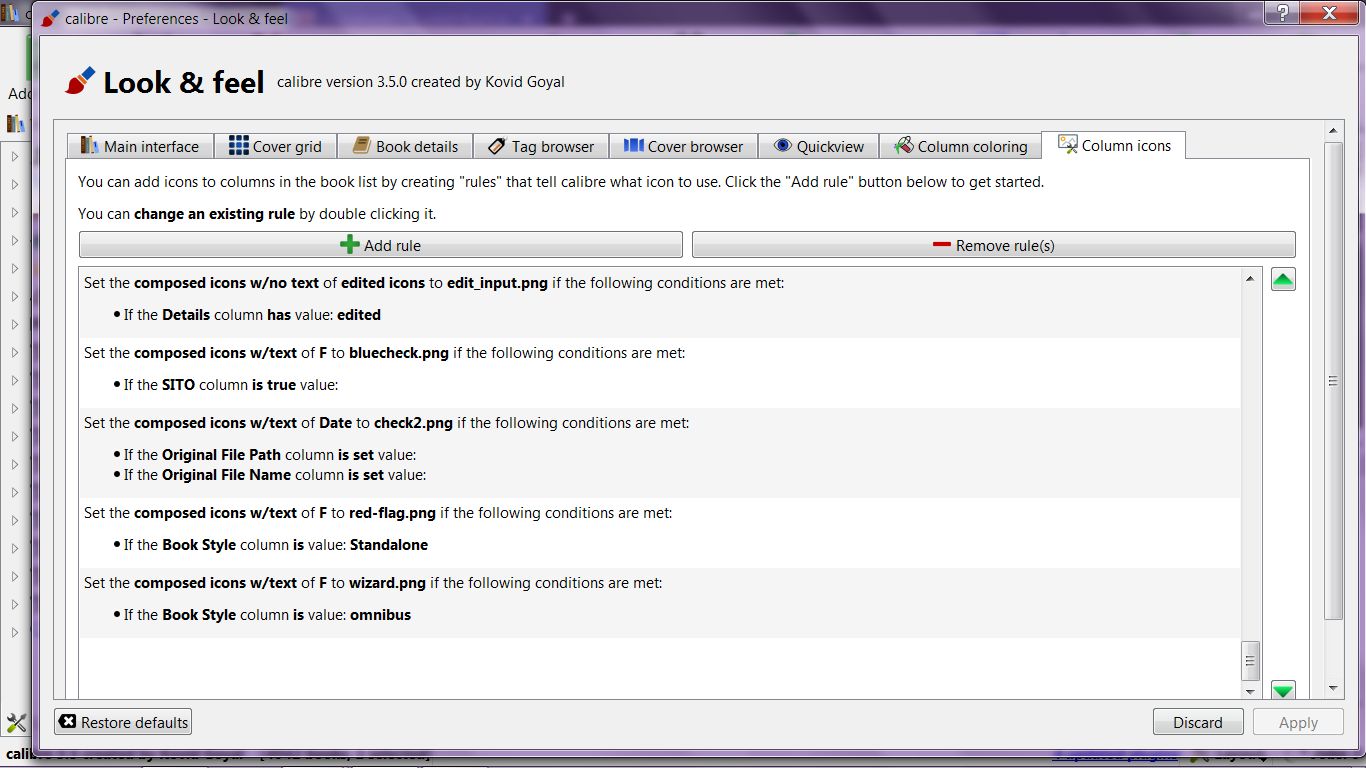 I hunted around for the images file but I can't find the one associated with this aspect of Calibre (icon rules). I checked the app data roming for images, the book cover images and a couple of other ones are there, but that's only a couple. I need to remove dozens. (duh..cc_icons) Last edited by Rellwood; 07-26-2017 at 04:50 PM. |
