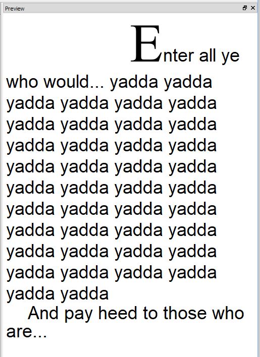 Now, it's the indent of the next paragraph that needs to be changed to make the spacing between the initial cap and the rest of the sentence correct. In this case, I could tweak for each different letter, but that still breaks if the text size changes.