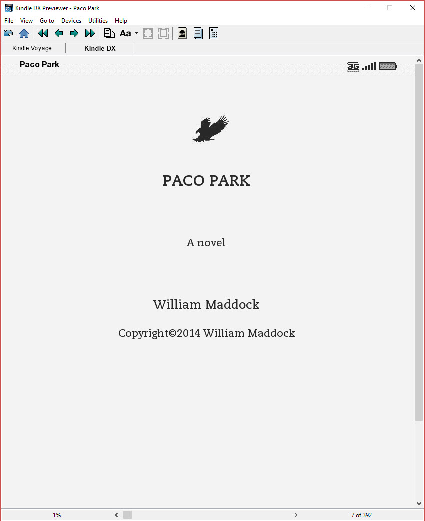 Your coding says, 50% of the width of the screen, which is the containing block because the Scrivener 5 class doesn't constrain the size; you use it to center the image, only (and provide top margin spacing). Right? Well, Wiliam, that Eagle damn sure ain't half the screen, in the DX. The DX is 824pixels wide, so this SHOULD be ~400px in width--and it's obviously not, given the original image is 90px wide. Is this what you're seeing, at your end? My best estimation is that the eagle is displaying slightly over its original size. Perhaps, 125-150% of its actual size. The KF8s all seem to be about right. Do we all agree on that? What am I missing? I mean that; we all know that I don't code daily, so I forget stuff. Freely admit it. What's working, in the DX screenshot? I mean, as it happens, the size of the Eagle image, on that screen, for that moment, works, even though it's not obeying the coding, but that's...coincidence. If it were, say, twice the size, it wouldn't. So: what do you think is happening here? To me, this isn't working. To me, it's displaying the image at just a bit over full-size. About 125-150pixels. Not half the size of the image, nor half the size of the screen. Hell, I don't know where it derived the size, unless we assume that like all images on KF7, the DX simply blew it up some percentage, attempting to make it fill the screen, as is KF7's wont. Anyone else have thoughts on this? I mean...if I'm not understanding what I'm seeing, I'm happy to hear them. Spoiler: