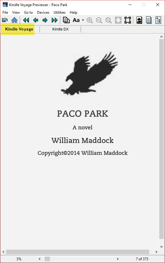 Your coding says, 50% of the width of the screen, which is the containing block because the Scrivener 5 class doesn't constrain the size; you use it to center the image, only (and provide top margin spacing). Right? Well, Wiliam, that Eagle damn sure ain't half the screen, in the DX. The DX is 824pixels wide, so this SHOULD be ~400px in width--and it's obviously not, given the original image is 90px wide. Is this what you're seeing, at your end? My best estimation is that the eagle is displaying slightly over its original size. Perhaps, 125-150% of its actual size. The KF8s all seem to be about right. Do we all agree on that? What am I missing? I mean that; we all know that I don't code daily, so I forget stuff. Freely admit it. What's working, in the DX screenshot? I mean, as it happens, the size of the Eagle image, on that screen, for that moment, works, even though it's not obeying the coding, but that's...coincidence. If it were, say, twice the size, it wouldn't. So: what do you think is happening here? To me, this isn't working. To me, it's displaying the image at just a bit over full-size. About 125-150pixels. Not half the size of the image, nor half the size of the screen. Hell, I don't know where it derived the size, unless we assume that like all images on KF7, the DX simply blew it up some percentage, attempting to make it fill the screen, as is KF7's wont. Anyone else have thoughts on this? I mean...if I'm not understanding what I'm seeing, I'm happy to hear them. Spoiler: