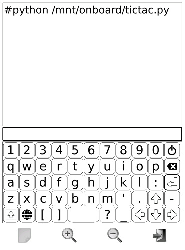 I have found one problem with it, I installed python on my kobo and when I try to play a simple command line based tic tac toe game with python like this, python /mnt/onboard/tictactoe.py it won't display the application. And then when I type a letter it quits the application and then shows the application in the history of commands you entered. But since it left the application I can't play it anymore. So the only way to get the konsole to show the application is to type in a letter, and the application doesn't recognize it as a valid symbol and quits. Then the application shows up in the history of the commands you entered. Is there a way to get it to display the application without quiting the application first? I hope you understand what I am trying to say. Attached are two screenshots.