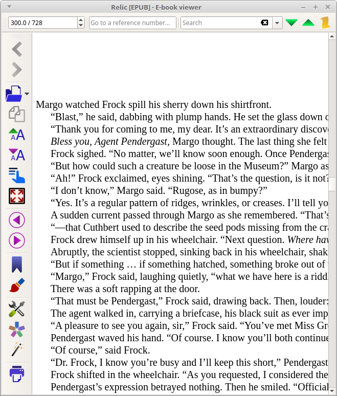 If I jump forward in a book, the viewer loses its brains for wrapping text. Each paragraph becomes one long line that disappears off to the right of the viewer, never to be wrapped. This is a repeatable problem. Example: Book: "Relic", by Douglas Preston & Lincoln Child Open in viewer: Progress indicator at upper left of viewer displays "1.0/728" Overwrite "1.0/728" with "300", hit enter, to jump to page 300 of the book Note that text does not wrap Note that purple "Next Page" button does not advance page Randomly jump around in book using vertical scrollbar on right of viewer After a bit of random jumping, wrapping starts to work again This happens in other books too, I just picked "Relic" as an example since it's a commonly found book that others may well have to test for themselves. The two attached screenshots below illustrate the "no wrap" error case, and the "correct wrap" case (after jumping around randomly and returning to page 300). Last edited by haertig; 10-28-2017 at 02:28 PM. Reason: Added more information |