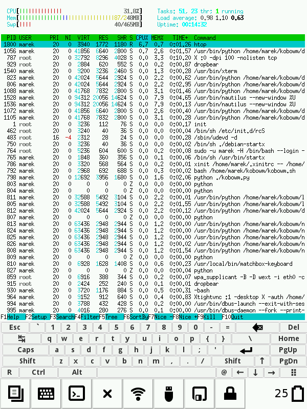 just passing by to say that thanks to marek I too have turned my kobo into a linux tablet. I have been using it for more or less a month and in the meanwhile I edited the original image. Mostly fixes (e.g. the blinking led) and customization (e.g screen/scripts/vertical orientation), but more importantly I made a new window manager, mostly because I was not pleased in one way or another with any one I tried. If anyone is interested I put the source on a github page, and the full image on dropbox. Good reading! Last edited by pasqu4le; 11-02-2017 at 07:26 AM. |