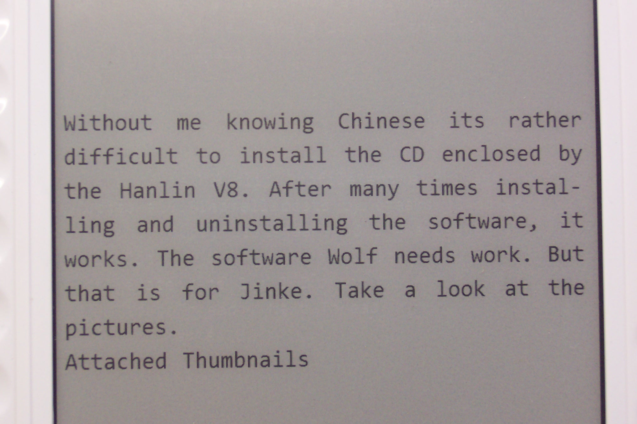 Without me knowing Chinese its rather difficult to install the CD enclosed by the Hanlin V8. After many times installing and uninstalling the software, it works. The software Wolf needs work. But that is for Jinke. Take a look at the pictures.