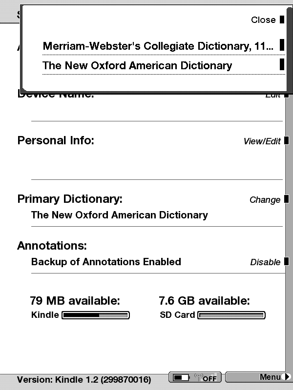I notice that Amazon is selling Merriam-Webster's Collegiate Dictionary, 11th Edition which is the dictionary I normally use at home in both the dead-tree and computer versions. Apparently, though, if I buy it I can't use it as the default dictionary for the Kindle look up feature.
