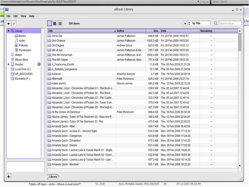 While we are training you, if you are interesting in downloading the books here on MR (sorry if you've figured this out already), here's how to do it. Go up to the top of this screen, click ebooks, select "Sony Reader" and all the books will show up. Browse, find what you want (there will be multiple version for each, I usually choose LRF), save it somewhere, then open your eBook Library, click File, then Import File, select it from wherever you saved it (I made a folder on my desktop for easiness) and tada! It's in your library.