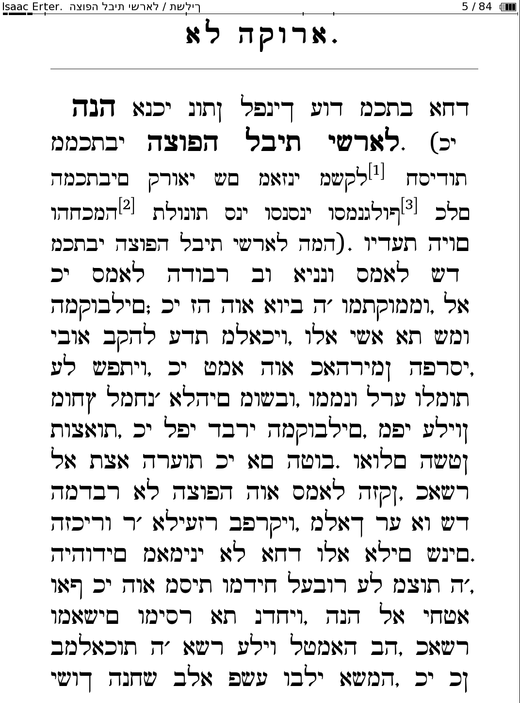 First, I miss a way of choosing between CR and the built-in reader, like an Open With. IIUC this is a firmware 5.17 limitation, isn't it? So I removed extensions.cfg, my only option of opening CR is to launch it from the poterm command line. Just linking the .app in /mnt/ext1/system/applications doesn't cut it, as CR needs a filepath as command line argument. Any better solution? Second, CR doesn't support RTL text in epubs. The built-in just does it, point. This was a determinant reason for me to choose PB. See screenshots. They are from pg45252 btw. I coded this book, I know that I handled correctly bidi. Third, I have an issue on exiting CR. The main screen is wrongly redrawn as if the display was smaller than its actual size. See screenshot of that too. This unfortunately survives rebooting. I quite think the problem is related to the theme LineCustom. I could revert to the right sizing selecting Line as a theme in Settings, but the choice was overridden again reopening CR. Finally I removed /mnt/ext1/system/themes/LineCustom.pbt to get rid of the problem. Apparently the theme was also responsible for some mangling of the icons in the standard read menu, which rendered e.g. Rotate nonfunctional. Last edited by EastEriq; 01-04-2018 at 03:38 PM. |