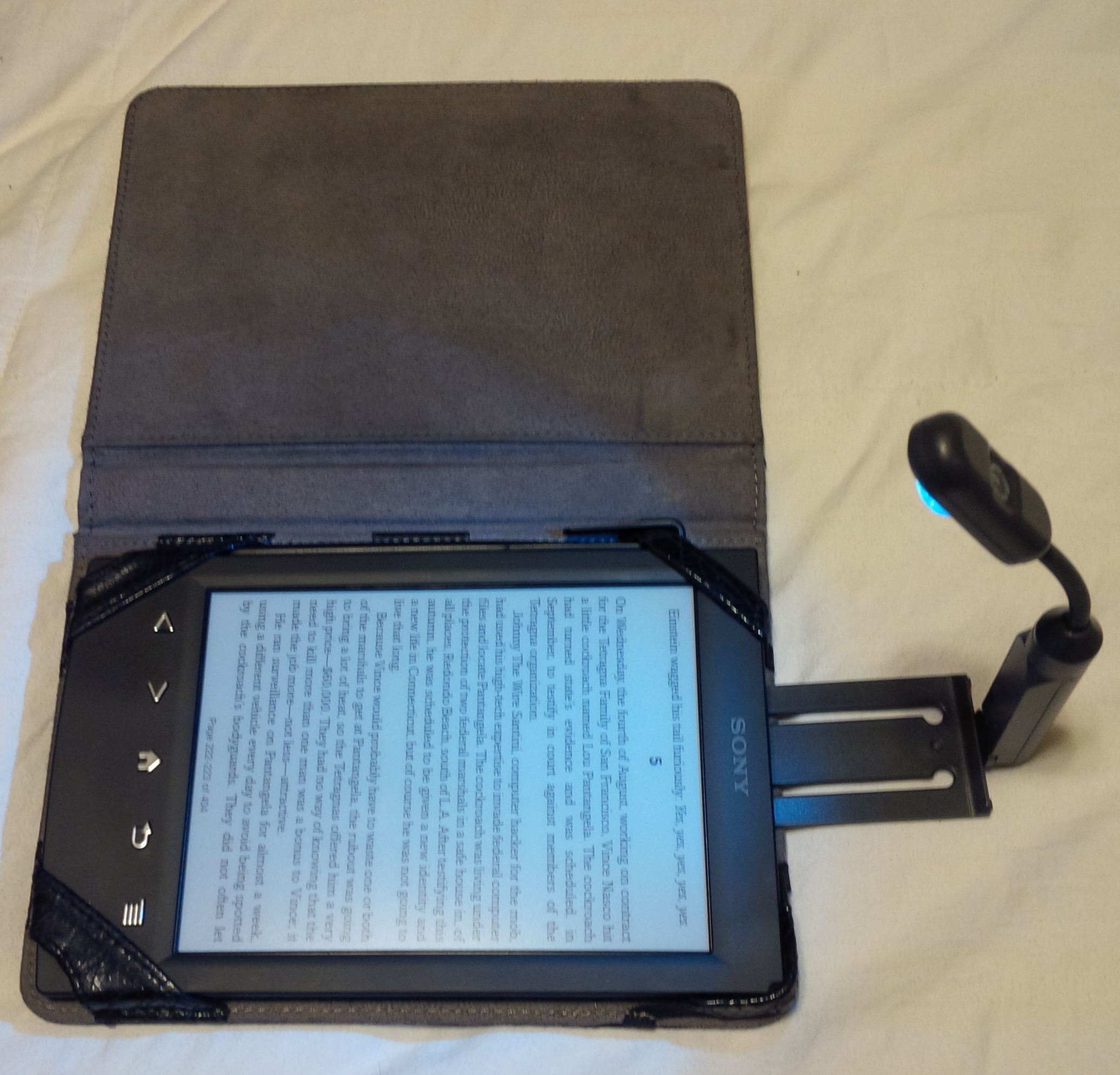 (Picture taken with my Blackberry Q10, so not the highest quality.) Another image added. This is how I use my E-Luminator on most of my readers. I just shove the end between the back of the reader and case. For those cases that custom fit the reader, I can flip the back cover over and just the E-Luminator to the front flap. These M-Edge cases actually have a slot on the side for E-Lumintors, but I always found myself trying to bend the neck of the light and it never stayed in place. Using it vertically like this, instead of horizontally, I don't have to mess with it for hours. You'll note, JSWolf, how pull the right, top strap off the edge of the reader when reading. it hangs slightly over the edge of the screen, which bugs me. Flipping it over like this, it works fine. I don't even notice it. Last edited by rcentros; 01-23-2018 at 07:56 PM. Reason: Added image |