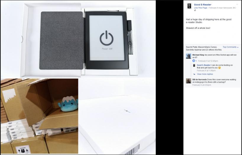 https://www.facebook.com/Goodereader I haven't seen any indication of backers from their Indiegogo recently receiving any devices. Previously, people would often post comments when they got their tracking number or their product. Still amazes me that they would ship to any new customers before fulfilling all the existing orders from the Indiegogo campaign. Especially since Michael initially claimed that they had temporarily closed their Indiegogo campaign so that they could better concentrate on fulfilling their existing orders. (That was before Peter let it slip that their campaign had been shuttered. And before people discovered that they had quietly started offering their devices on Amazon and on their own website.) Quote:
