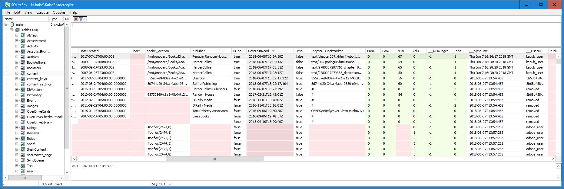 And I'm pretty sure that timestamp is the problem. I installed 4.8.11090 on my Glo. Everything seemed to be OK including the books displayed on the home screen. After seeing these timestamps, I added a couple of books. And they appeared as the first two book. Opening other or these didn't change anything. When I looked the database, I saw the same sort of timestamps. So, I fixed them to be the same format as the other timestamps, and everything was OK. What I would say is that a change has been made that is writing the timestamps in this format. But, the reading code is not handling the format properly. I don't know if this means that there is an error happening that returns a bad value, or if the conversion back is just giving a wrong timestamp. If it is the latter, it might fix itself after a few days when the current time catches up to whatever the timestamps is being converted to. But, then it will fail again when the next time books are added to the device. Until Kobo fixes this, a workaround is to use calibre and my Kobo Utilities plugin. The "Update metadata in device library" can set the date added to one of the dates in the library. This will set the __SyncTime in the correct format. Another way would be to write a database trigger to use the correct format when the books are first added. It shouldn't be to hard, so I'll leave it as an exercise for someone