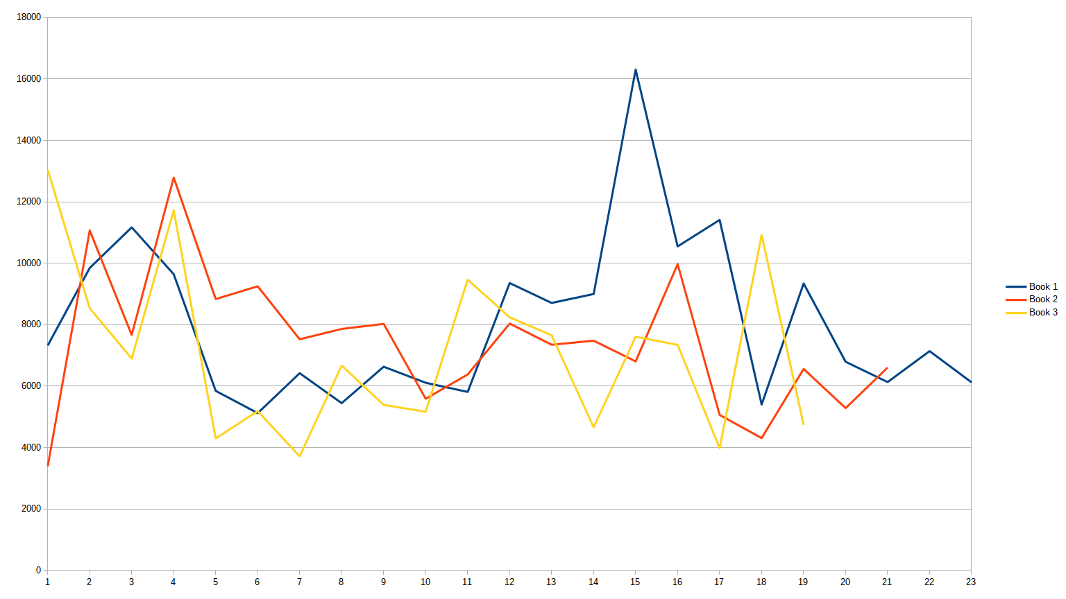 = = = = = The statistics blog: I could take book suggestions, and randomly pick and choose from books I've seen mentioned on MobileRead/Reddit. I also think tackling books in a series individually + together would be interesting. The stats can be generated relatively quickly, and there are always more books to test. Once the methodology is down flat, the same analysis can be applied across books pretty consistently. Then it's just digging through and trying to find what interesting quirks I could dig up, or new ways to look at old data. Lately I came up with a method to break things down on a per-chapter level, so I could generate a chart like "# Words per Chapter" across all three Lord of the Rings books: Have you seen my posts?