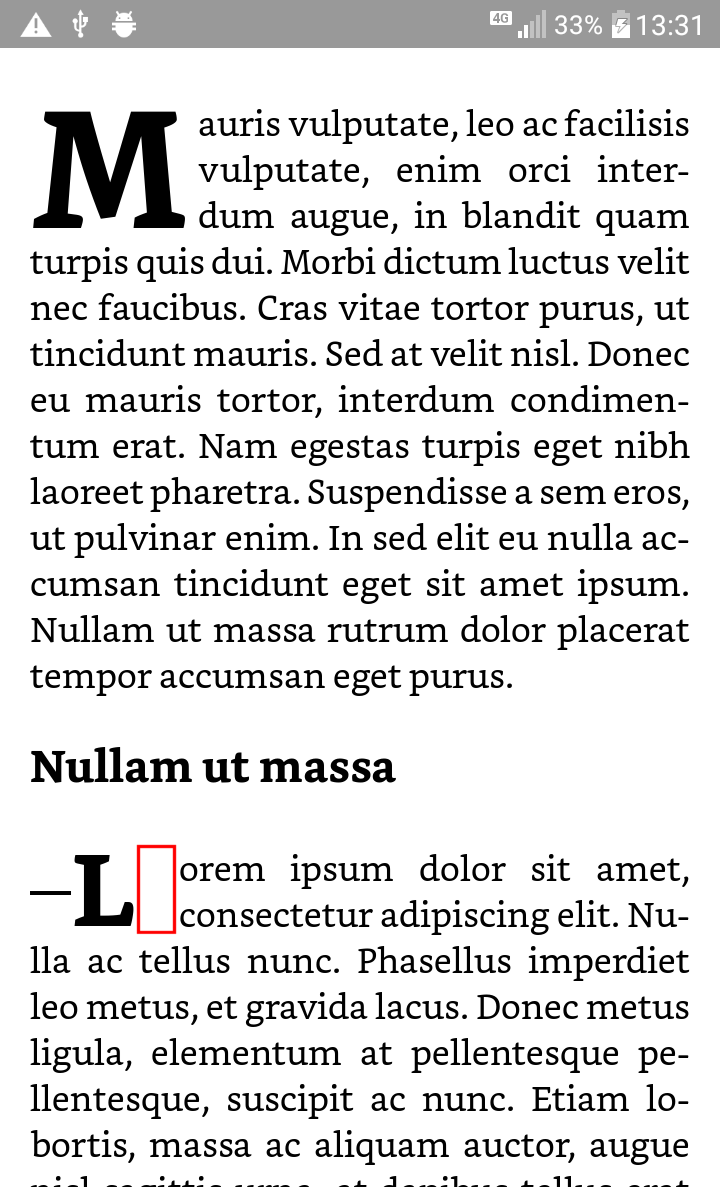 As all you know, Amazon has developed a new ebook format, .kfx. Supposly, that new format, among others things, would deliver perfect drop caps for all kindle devices with support for .kfx. However things not to seem being so. Many times, before the drop cap there is a symbol (an "em" dash, a quotation mark, a question mark, etc.) and when that is the case, then things look awfull under .kfx (but they look fine under .kf8). Watch the picture below: In Kindle for Android, the page break after the drop cap is not present, but the cap (—L) looks tiny and there is a big gap before starting the text. I made a lot of trials but I couldn't fix the issue. The code I'm employing now (and works fine with .kf8) is the following: Code: