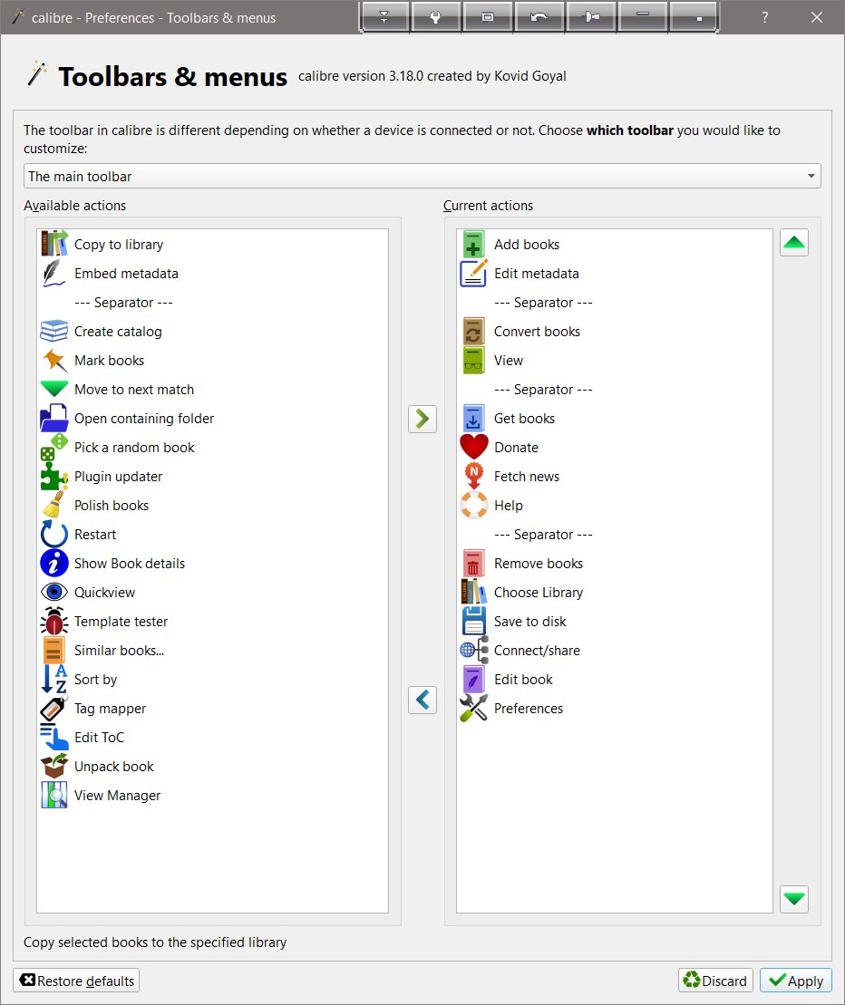 If you have a device attached try disconnecting it. If that doesn't work you could try uninstalling calibre and reinstalling it - you shouldn't lose any settings or libraries - but I don't see why that should fix it. FYI - defaults for Main toolbar and Main toolbar when device attached BR Last edited by BetterRed; 07-09-2018 at 09:24 PM. |