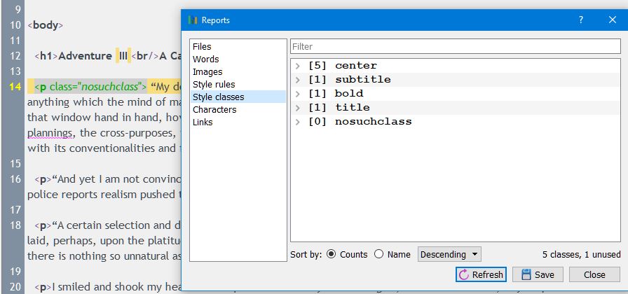 If the count = [0], does that mean it's not explicitly defined? I always took the [count] to be the number of places it was used in the epub so if I did have a count of [0], I thought I had defined a class in a style sheet but did not use the class Since 'nosuchclass' was actually used one place in the book, I'd have expected [1] and not [0]. I was looking to find somewhere that 'nosuchclass' was used (one time) but not defined. [Tools, Remove Unused] will delete it, but I wanted to at least look first Last edited by phossler; 07-28-2018 at 10:42 AM. |