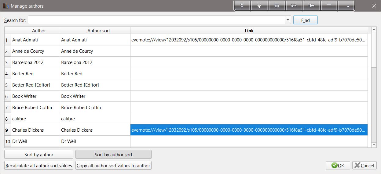Further your reply suggesting to link calibre and Evernote for maintaining book and author info pages I installed Evernote that I'm learning to use and I created a Notes custom column as per your indications. I have been able to link my first EN to a specific book record in my calibre library. So far so good. However as it is info related to a specific author and not a specific book could you help in letting me know how to link the note not to Book but to Author so this info could be available from any book by the Author? Many thanks in advance. Cheers. Patrik |