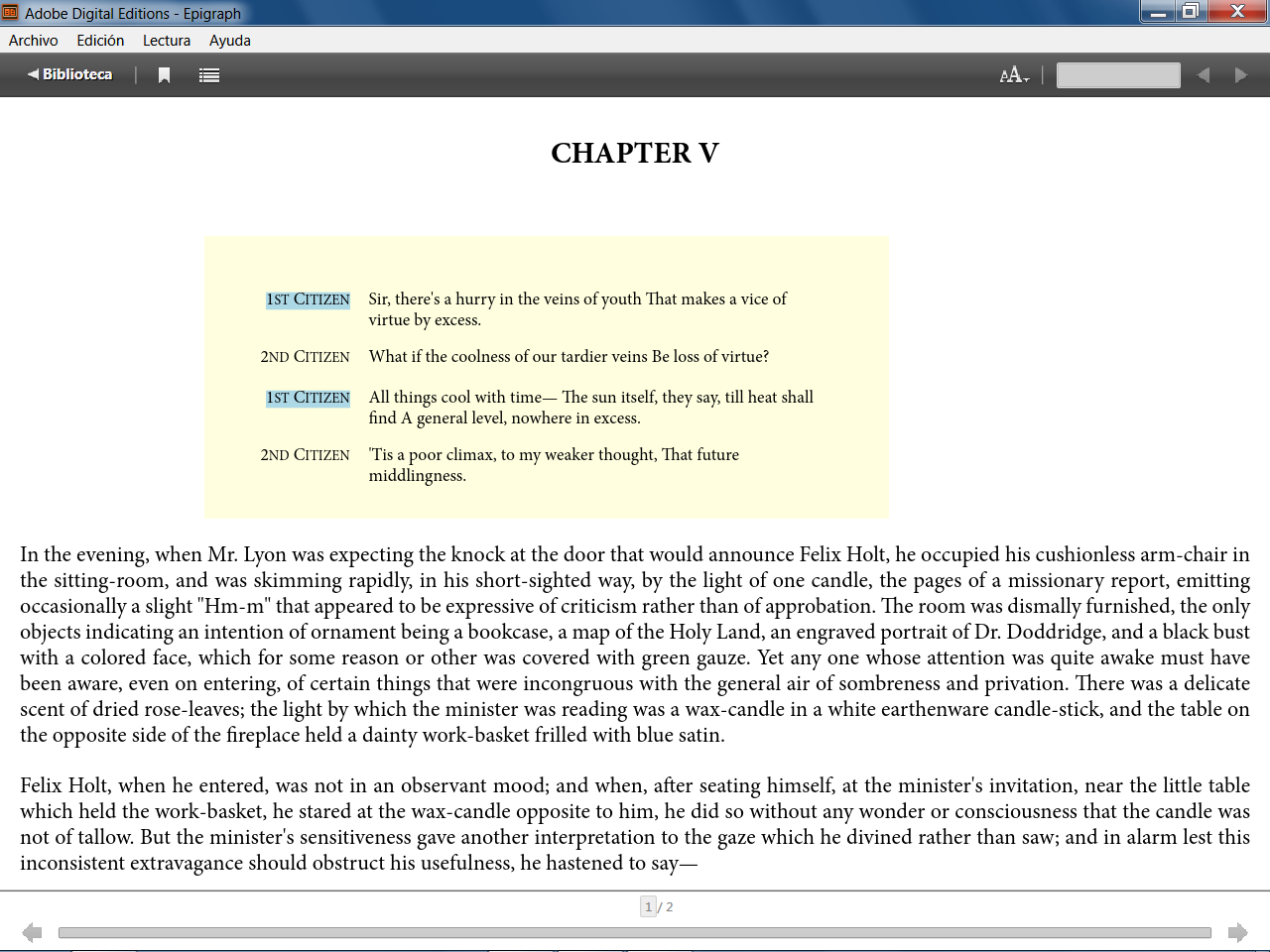 The attached image is part of the epigraph for chapter 5 of Felix Holt, the Radical. I gave up on this, but there is a similar layout in chapter 38 of Daniel Deronda and I want to try again.