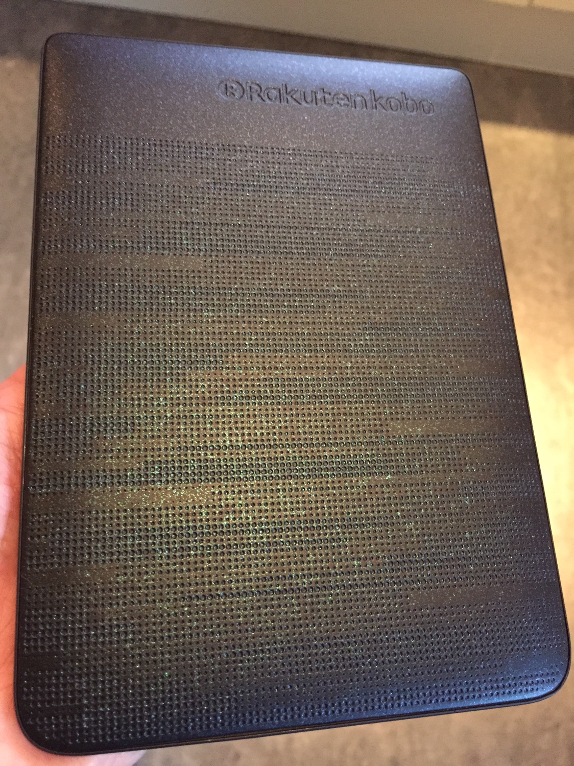 Tips: 1) clean the surface with alcohol. 2) put the spray can in a pot of very warm water for a few minutes before spraying. It’s helps with atomization of the rubber. 3) the first coat should be a light coating, let it dry before the next coat. 4) subsequent coats should go on heavy. 5) the more costs the thicker the coating and the better. I did 5 costs. It does pick up more lint/ stuff than smooth plastic. But it all brushes off easily enough. No you don’t have to do the front bezel, I only did the back cover. -Edit- I just noticed there is a small piece like a fingernail that was starting to lift up on the rear corner. My OCD got the best of me and I peeled the whole thing off in one piece. It is a perfect facsimile of the textured pattern on the back, including the Ramirez Kobo logo. The upshot is my spray can should have at least another 20 or so jobs worth in it, considering how small the area is that I’m covering, and for me it’s readily available in several local stores so I can easily enough just spray on another application tonight. |