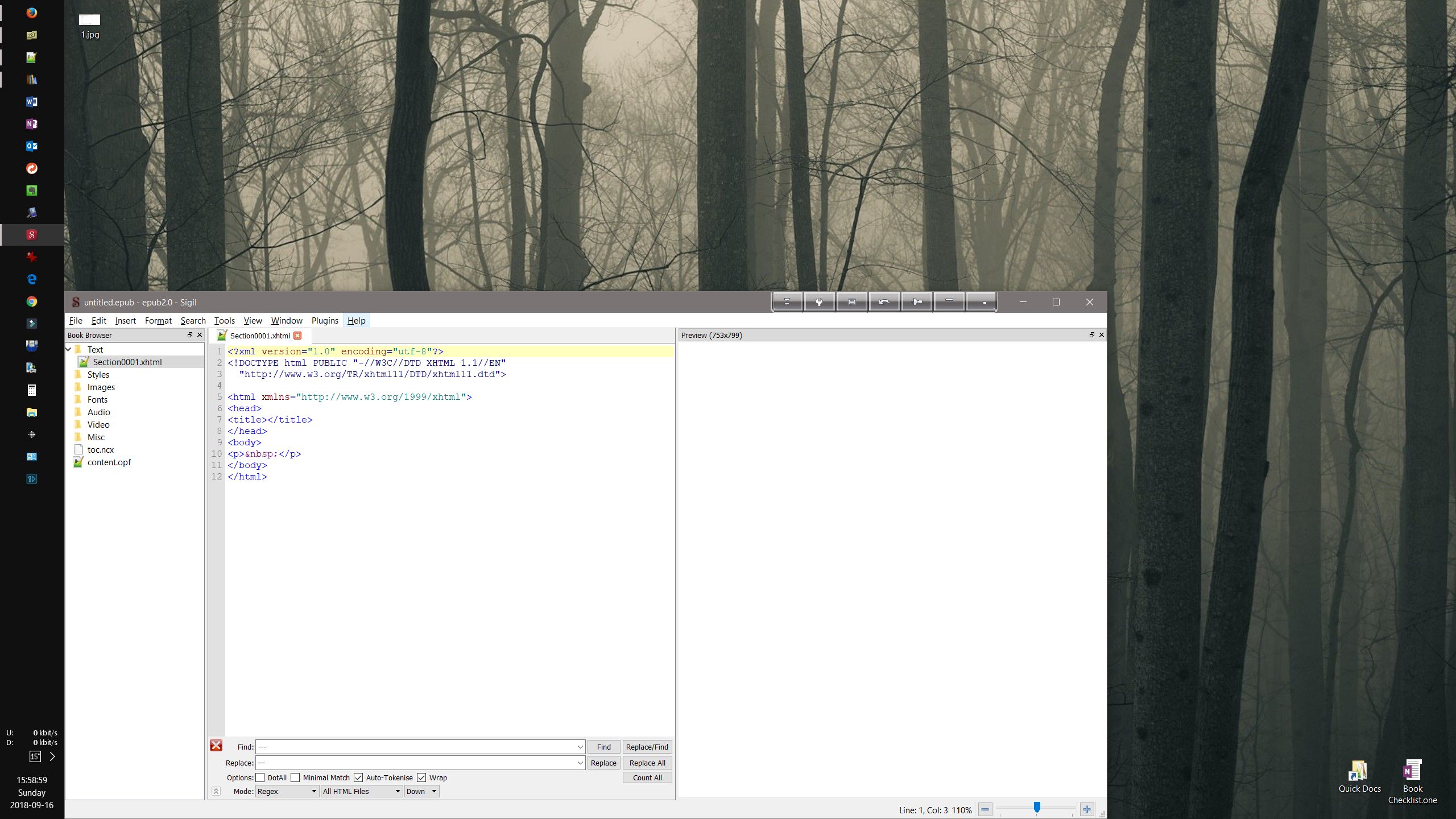![]() I have difficulties using a 'pointing devices' so I only use them when I must. And I never liked button bars, even before my hands got smashed. I use my second monitor for web watching, ftp, news, email, long running video edits etc. Don't have room for a third, anyway its not needed; as you can see from the screen shot, I don't run Sigil maximised, nor anything else. BR |