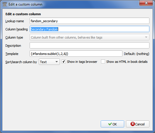 {#fandom_main} - {#fandom_secondary}/{author}/{title} ({#story_id}) change to: {#fandom_main:sublist(0,2,\,)} - {#fandom_secondary:sublist(0,2,\,)}/{author}/{title} ({#story_id}) In case your column definition is like tags. If not, you need to check if your list separator is a comma or something else and correct the separator to what ever you are using. The result should be something like fandom_main1,fandom_main2 - fandom_secondary,fandom_secondary\author\title (story_id) It takes from each of your two fandom columns list the first two items. |