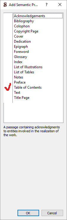 cover.xhtml (Cover) titlepage.xhtml (Title Page) Chap01.xhtml (Text) Chap02.xhtml OR, better yet, the Add Semantics menu could list all the files with semantics, similar to Tools > Table of Contents > Edit Table of Contents: Maybe in this form: Code: