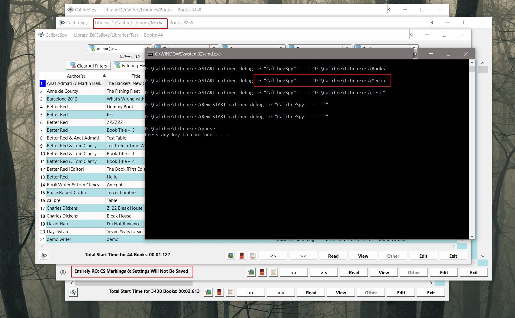 See the image in the OP re: emergency use only. Make a copy of the .py and .bat and change them per the comments in each. \config\plugins\calibrespy_cli\... Rename them so they never get overwritten.