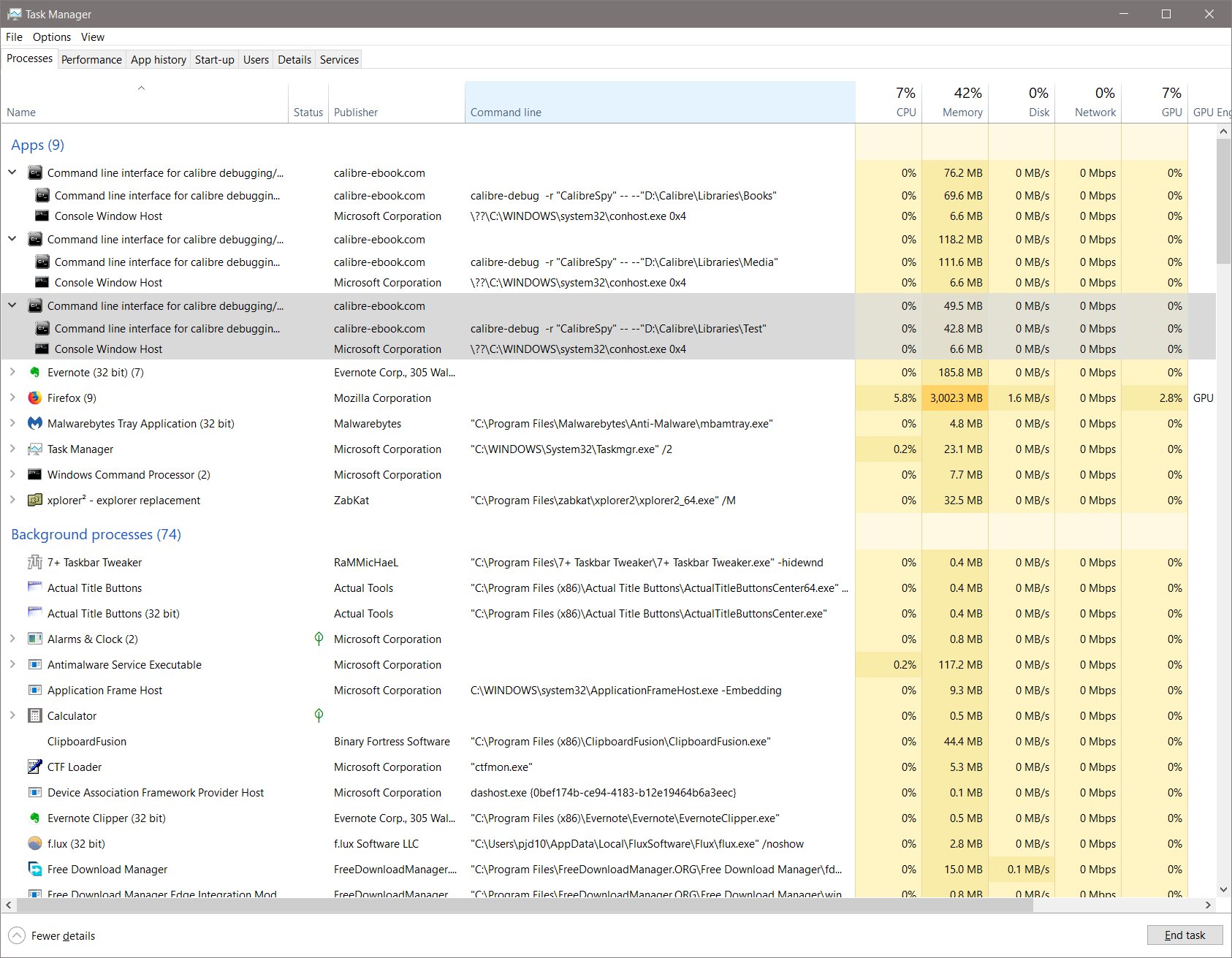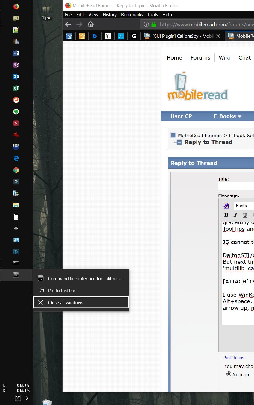 I use WinKey+T and arrow keys to select a calibrespy window, and Alt+space, N to minimise it again. When its time to close down I use Win+T, Menukey, Close all windows, viz: To me that's a perfectly valid way to close tasks gracefully. I've been doing it for decades. On XP I used an addon to give me keyboard navigation of the taskbar. I do it all the time for Office and other multi-instance programs. If I open each calibrespy window and click its Exit button individually, and I close the cmd windows individually I don't get the locks. I've patched my version of calibrespysettings_remove_multiuser_status.bat into the top of my multilib_calibrespy.bat. Feel free to suggest a better way, but I'm happy with that. I can't remember the last time calibre crashed, assuming it ever has, and I'd bet next weeks lunch money calibrespy has never crashed. So I'm happy to take the risk of running multiple instances of CS for hours on end. Being able to flick in and out of different libraries is a boon. Thanks for the Ctrl+L tip, I should have guessed that ![]() BR Last edited by BetterRed; 12-07-2018 at 01:16 AM. |
