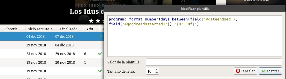 @davidfor I am reading your comments carefully. Thanks to run with the word program. It has been overlooked. several eyes see better than two. I have changed the format so that I do not get the result in decimals with this syntax: program: format_number (days_between (field ('#dateendded'), field ('# goodreadsstarted1')), "{0: 5.0f}") I must revise, similarly because with some dates it does not calculate me and they are loaded in the same way. Last edited by chaley; 12-12-2018 at 09:31 AM. Reason: Turn huge image into an attachment |