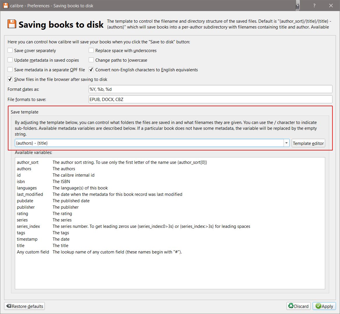 can someone please write the code for me to arrange my save to disk folder format just to have the ebooks....not sorted by anything?