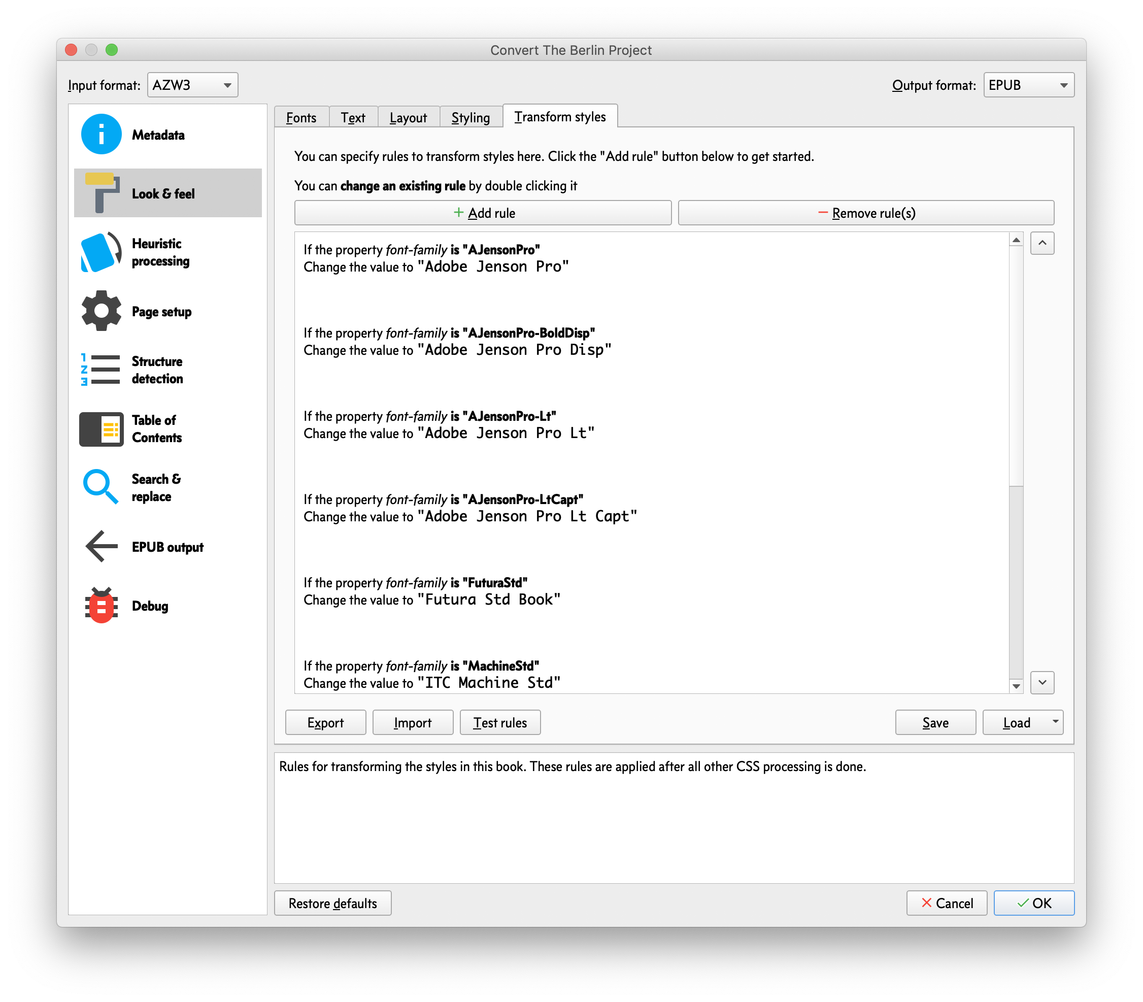 I thought that the transform styling tool should work for that purpose. But when it didn't work, I thought perhaps @font-face rules were deliberately excluded for some (technical?) reason. So, it seems this may just be a bug in the conversion process when Calibre applies the transform rules. Here is a screenshot of some of the transform rules that I've set up: Here are a couple screenshots of the original eBook CSS before conversion: Then after conversion, here are a couple of screenshots. You can see that the @font-face rules were not transformed. I would like to embed the fonts in all of my EPUBs if they aren't included already. Although I realize this increases the size of the books, I would like to view the books as they were intended by the author/publisher. I'm not a font expert, but as I understand it, the problem with the embedding process is due to how different platforms (macOS, Windows, Linux) refer to the fonts and also differences between identification of .TTF and .OTF versions of the same font across the platforms. In the CSS, the font may be listed as "AJensonPro-Lt" (from Windows?), but macOS sees it as "Adobe Jenson Pro Lt". So, when Calibre tries to embed the font, it doesn't see the font from macOS as it is listed in the CSS. I realize that this may be a big undertaking, but font substitution would be a cool feature to add. That way, the user could set up the fonts to substitute, not only for editing, but also for previews and the E-Book Viewer. I wish the OSs would support font substitution natively and allow users to tweak them. Let me know your thoughts.. Thank you in advance! Jonathan Last edited by JonnieCache; 04-21-2019 at 04:21 PM. |