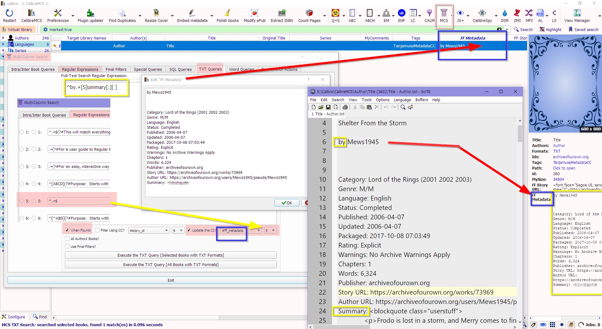 Running multiple regex saved searches should work, though. I have like 20+ of those for my AO3 direct downloaded fanfics (yes, I have a lot of custom columns). Hence, I usually wait to process stuff in batches of at least 10. It’s pretty quick to go through all the saved searches though. Just a continuous Load search/replace and click Apply, rinse and repeat until done. Either that or convert the metadata into a format that FFF will accept. |