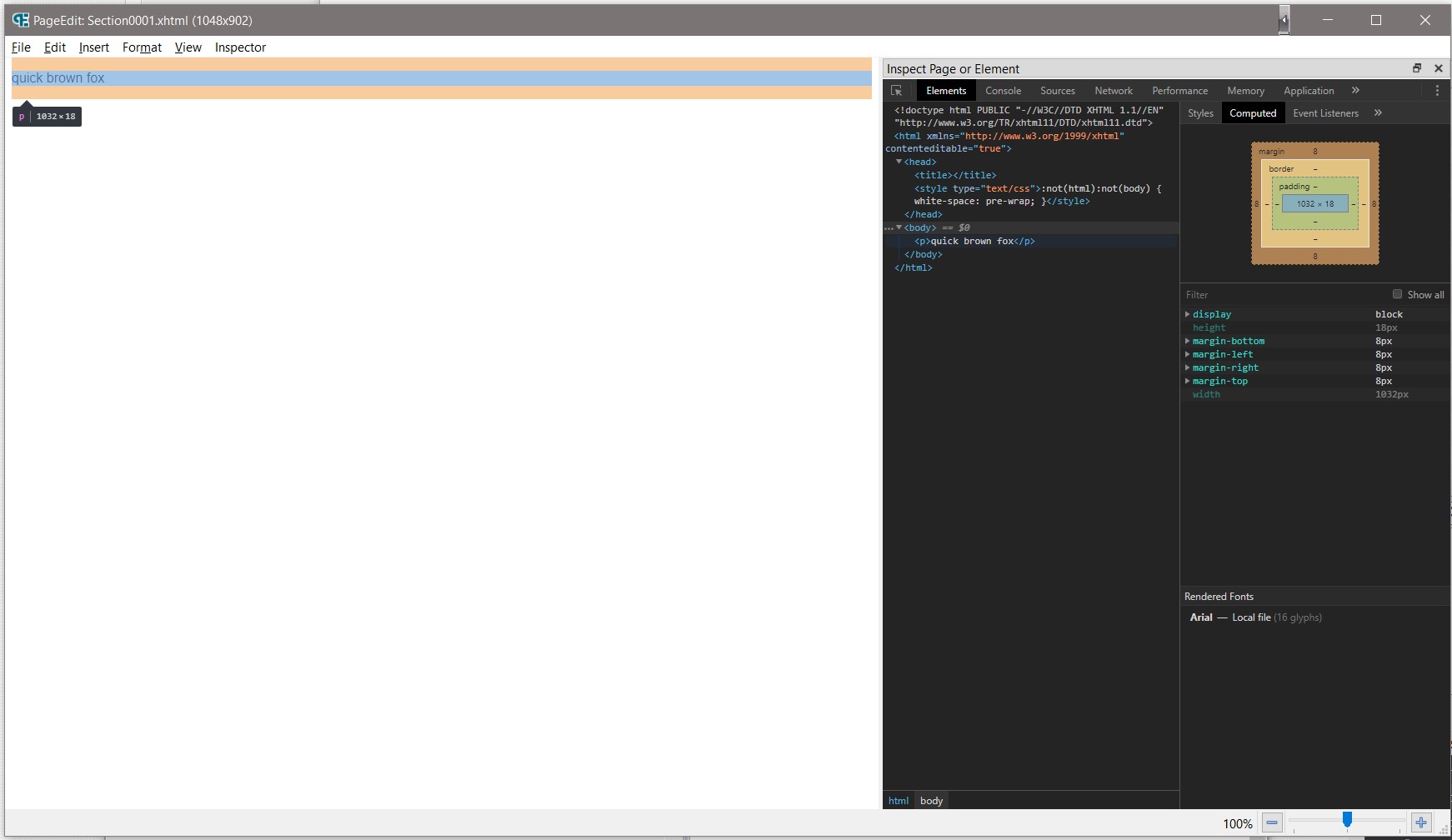 After persevering with clicking buttons (which you know I hate) and restarting (Sigil & Page Edit) I managed to enforce the Dark theme on the Inspector gadget in both - and it sticks in both Can you consider making the Inspector dockable in Sigil, or putting it back where it was - affixed to the Preview window. I don't like windows that I can't park somewhere. Attached is a screen shot of where I have it in Page View. I ought to mention why I tried the Dark theme. I was looking for a way to increase the Inspector's font size. When nothing leapt out at me I thought I'd try the Dark theme and…. But now I have it working, I do find it much easier to read. But it leaves the question - is there a way to increase the Inspector's font size. Where are the Inspector's Settings stored ? I have SIGIL_PREFS_DIR=C:\_AppData\Sigil\Prefs, could you add something to PageEdit to use that or a similar EnvVar. No urgency about any of that. BR Last edited by BetterRed; 07-23-2019 at 09:03 PM. Reason: replace screenshot |