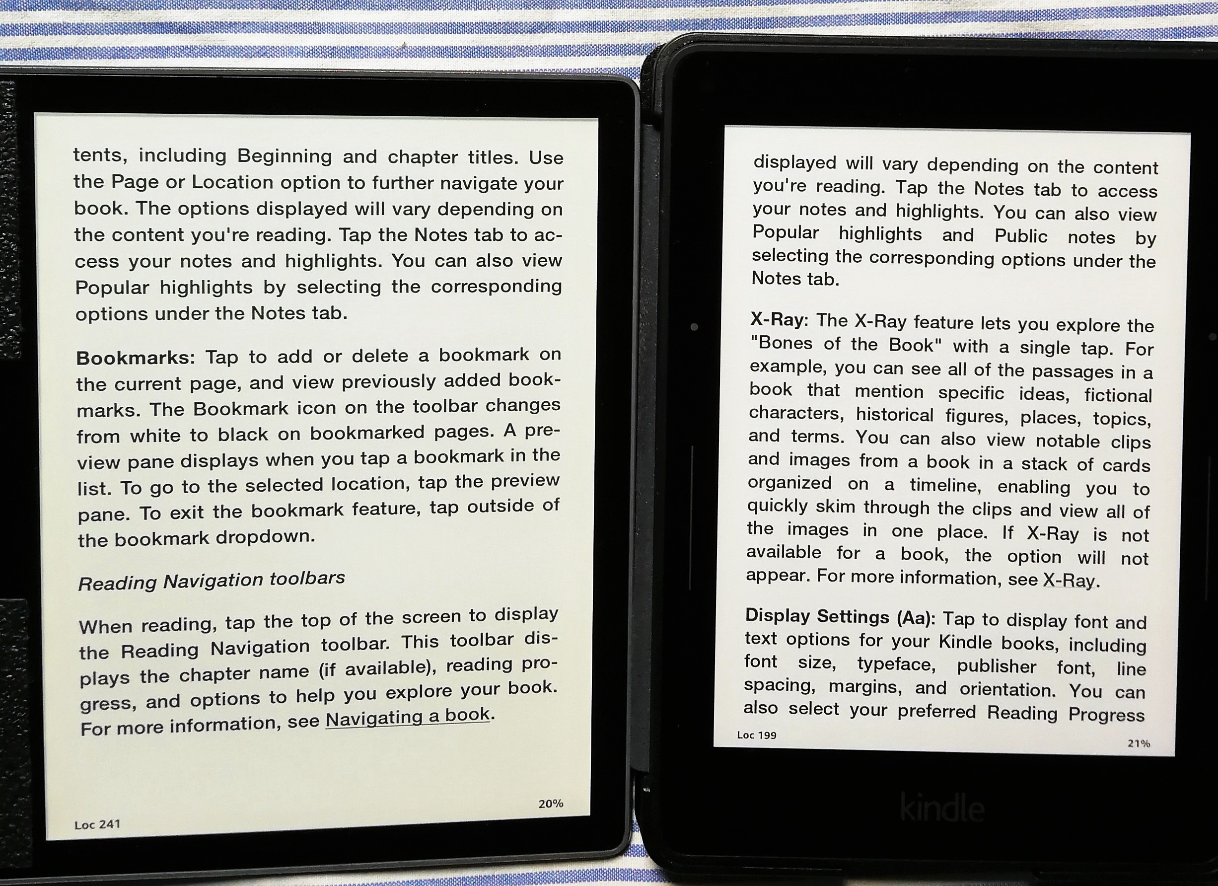 Anywho, I only compared a wee bit yesterday between the 2 and the voyage and O1. And I agree with the comments and photos posted. Although my O2 was never as warm as compared to the Voyage. It was closer in my case. I don't notice much difference with the O3 in bright daylight as I don't have the light on very high. The warm setting is depending on how high the light is set so in bright light at light #8, its just barely warm. Looks great though. Very even. Most even lit kindle yet. I shines when inside and less bright light as far as the warm setting goes. I am still playing with the settings to find my spot. I also found the font either darker just a tad as the O2, or the contrast. Or maybe its the backround, I can't say. All I know that side by side with same light level, the O3 was easier to read. I don't think though unless holding them next to each other it would be noticable while reading. My O2 had a fine screen. But the warmer tone does seem nicer on the eye in inside, not much bright light conditions. Is it faster? I can't tell. To be fair though its a new device and doesn't have as many books on it or has been used for a long time so I expect it to be faster just based on that. |