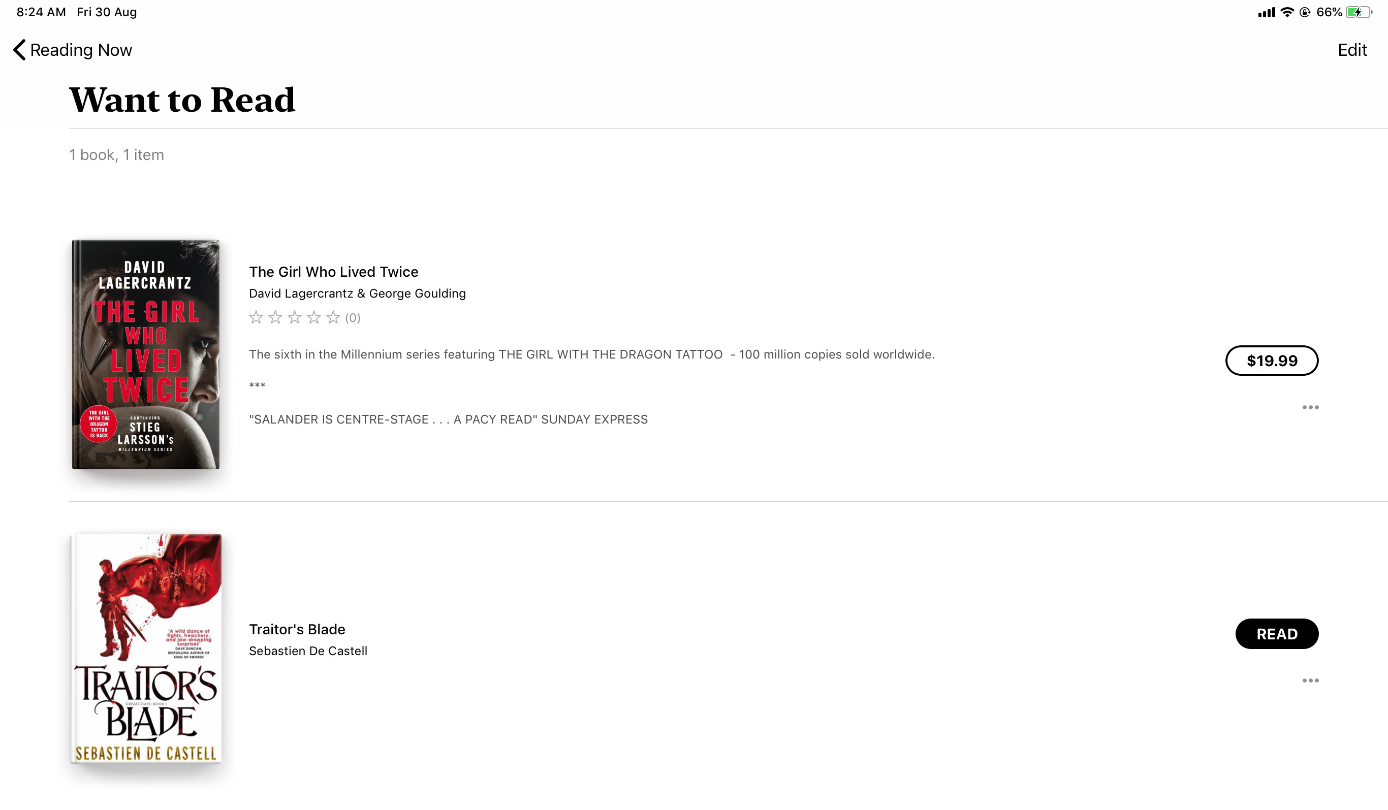 ![]() In the books app on an iOS device there is now a Want to Read section where you can add books that you want to read from the book store. When you click on the book it will pop up a description of the book, or if you view it in the Want to Read section you can see a partial description. When I manually add a book to my device and add it to the Want to Read section, my manually added book doesn't show the description nor do I get a pop up when I tap on it, it just opens the book ready to be read. In Calibre I've added a description in the comments section but it doesn't show up in the books app. Anyone have any ideas on how to get this working? I like to add my books on to my device to read later but sometimes forget what the book is about so it would be handy to have the books app show the book description. Image attached of a book added from the book store and one I've manually added to my iPad. The one added from the store shows a description which is what I want to happen for my manually added books. Sorry for being so long winded. Thanks heaps! |