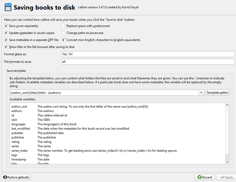 BetterRed, with regard to saving to disk, i assume that this changes the behavior of calibre when it saves my master files... so will it create a new directory or write over what i already have (masters)? Also, in looking at the template, i see the default and have compared the existing files, makes sense, however i don't understand why calibre truncates* the titles? Why does it not just name them as they are instead of modifying them? (which is part of the problem of the file names not being consistent). With the goal here being no matter how they are copied or saved have/leave the names/titles as they are without modifying them and creating issues. Again, i really don't care what they are named, but it's crazy that so many changes are being made (see example below). I just want one consistent name for the file throughout the process, so no matter how or where it is copied it remains the same, avoiding this mess. Sorry for being so long winded! *example: "The New Confessions of an Economic Hit Man" becomes, when copied to root folder by calibre "The New Confessions of an Econo - John Perkins" and then depending on how it is copied to my device it becomes "New Confessions of an Economic Hit Man, The - John Perkins" - Thanks PS - no files have been altered in the root folder & calibre was set to scan only one folder on my device (ebooks). Last edited by tomx2; 09-07-2019 at 03:54 PM. |