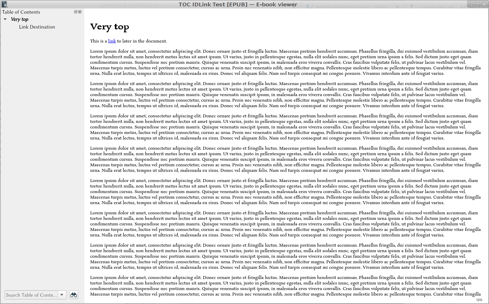 A minimal epub that exhibits the problem for me is attached. The TOC "Link Destination" entry doesn't jump down to the "Link Destination" h2 header. Neither does the inline link at the top of the document. Both work fine in calibre 3.x (I just re-tested in 3.42 on another machine, but it was working in a more recent 3.x on my primary machine until I updated to 4.0 yesterday). This is on Ubuntu 16, with calibre 4.0. Code: $ cat /etc/lsb-release DISTRIB_ID=Ubuntu DISTRIB_RELEASE=16.04 DISTRIB_CODENAME=xenial DISTRIB_DESCRIPTION="Ubuntu 16.04.6 LTS" $ ebook-viewer --version ebook-viewer (calibre 4.0) Thanks for your time. | |