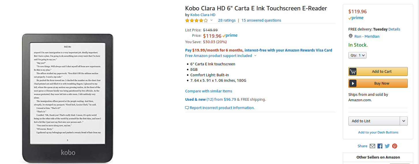 Amazon is offering Kobos (Aura, Clara, H2O and Forma) for the same price Walmart is selling them for (except for the Aura, it's selling for $100), all available by Tuesday where I live, with free 90 day Amazon support (whatever that amounts to) and the option of financing them for 6 months on the Amazon Rewards Visa Card. What's the deal with that?