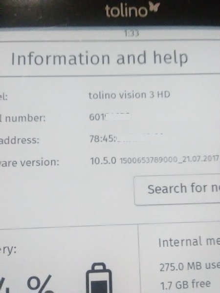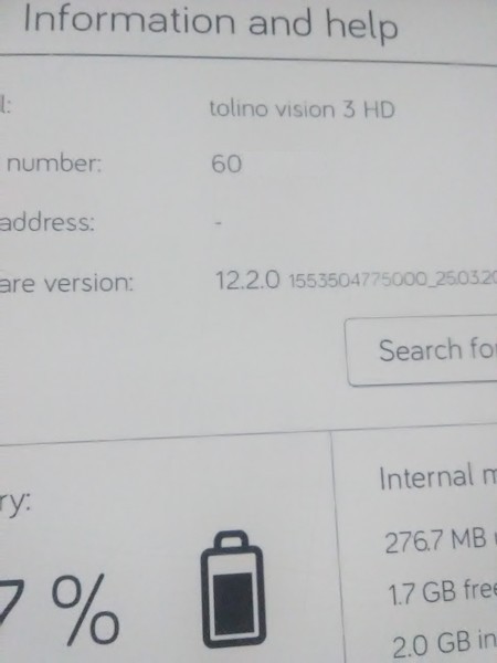Other than a firmware version that I have never seen listed as being available for a Tolino Vision 3 HD? Though I've seen it for a Shine. Did someone manually install the firmware? I'd suggest a manual install of the latest firmware for the Vision 3 HD using the 1.7.1 to 10.1.0 upgrade package.