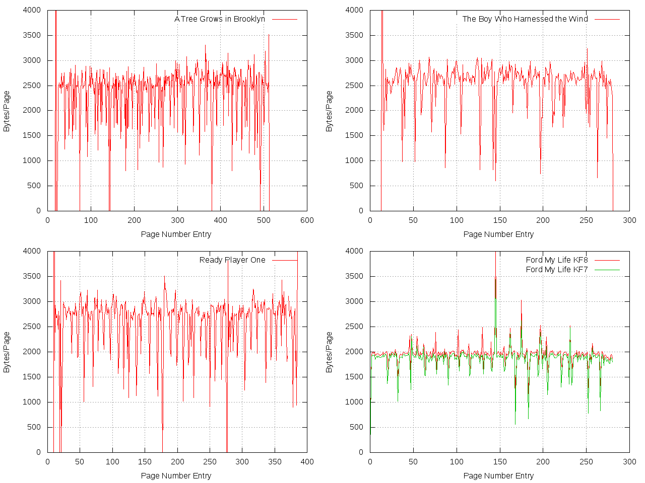 The table in post #1 took so long that I forgot to attach and comment on the data plots. Most books seem to be between 2500 and 3000 bytes per page, but there can be quite a bit of variation, with Ford's autobiography is around 2000 and Utopia For Realists 1500.