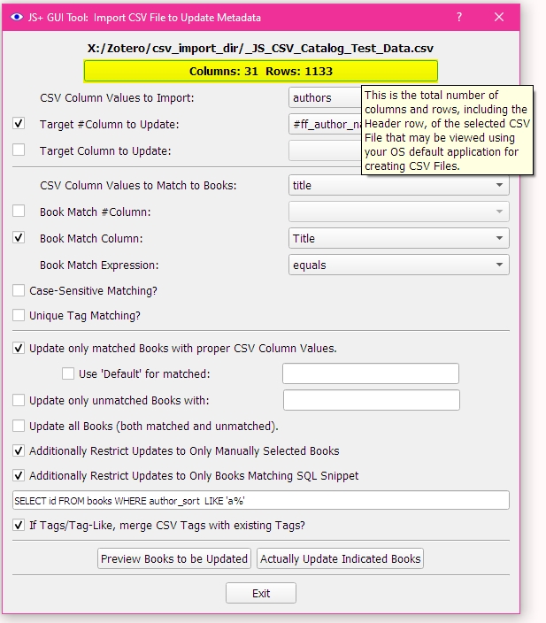 Version 1.0.167 -2019-11-02 Enhancement to GUI Tool "Import CSV to Update Metadata" to save the last 12 CSV files' options for future automatic loading when the respective CSV is again used; Original Series custom column option added to Customizing for JS Quality Fixes; English title-casing option used for both Titles and Series added to Customizing for JS Quality Fixes.