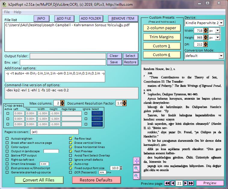 k2pdfopt -mode copy source.pdf Did you want the output to be nearly the same size as the input? Doesn't seem much point to using k2pdfopt for that. You can separate the columns: k2pdfopt -mode 2col source.pdf ...or to see your highlights (bitmapped output): k2pdfopt -mode 2col -c -n- source.pdf I've attached the result from the last option. |