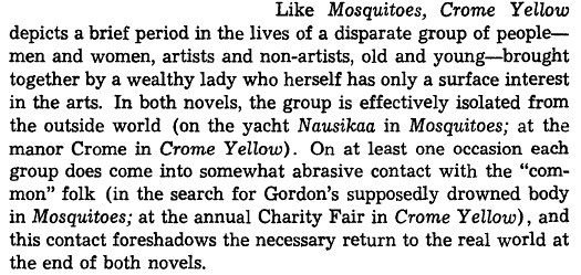 A 1977 journal article credits Crome Yellow as the inspiration for William Faulkner's Mosquitos, which was published 5 years later. I have included a snip of the article below. I wrote my thesis on Faulkner back before I went to law school, so I apprecaited this. The cite for the article, for anyone who has JStor access is: