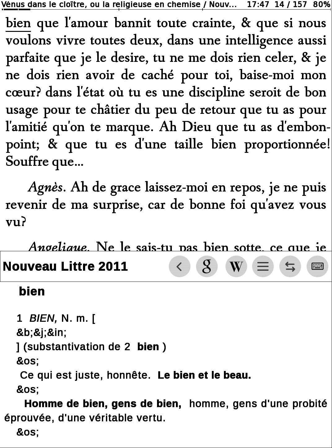 ![]() But I spoke about "Le Nouveau Littré". It means the new "Littré". The "Littré" is free but "Le Nouveau Littré" is not. So, I wonder if it's possible to recover the one that is inside my Vivlio. Thanks |