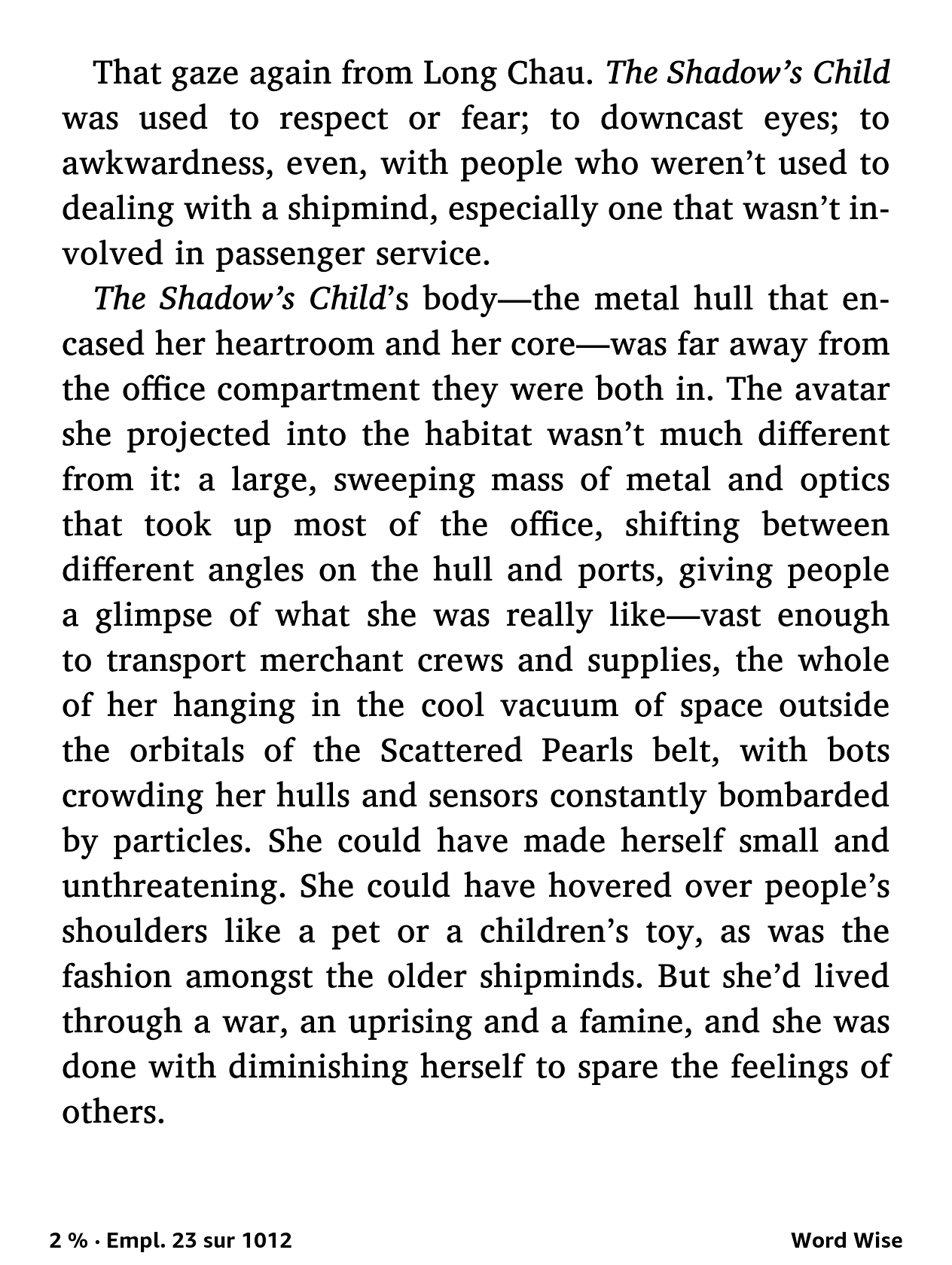 That said, I don't want a reduced line height. On the contrary, I edit all my books to augment the line height to my liking. I'm not interested by more text per screen page, really not. My Oasis keeps the same thickness whatever the number of screen pages for a book. ;0) Thanks for your answer, anyway. Edit: I've just tried v1.1 from here: https://www.mobileread.com/forums/sh...d.php?t=184056 I've already tried it in the past. I'm sorry but I prefer Veleka for my Oasis. ChareInk is too bold and the line height is too small for my eyes. The text seems too compressed for my liking. I don't understand your comment about kerning as there is no kerning issue with the version of Veleka I'm using. Edit 2: I've compared a word starting by "Ve…". The spacing is the same with both Veleka and ChareInk. Edit 3: I've taken two screenshots. Under close examination, I can see some subtle difference in the spacing between both fonts. But not where expected. I won't say there is no kerning at all. Eventually – for my eyes – Veleka with boldness set to 1 works better. ChareInk at level 0 isn't bold enough, and at level 1 it's already too bold. Anyway, again, thanks for your suggestion. Last edited by Pyjam; 02-19-2020 at 05:18 PM. |