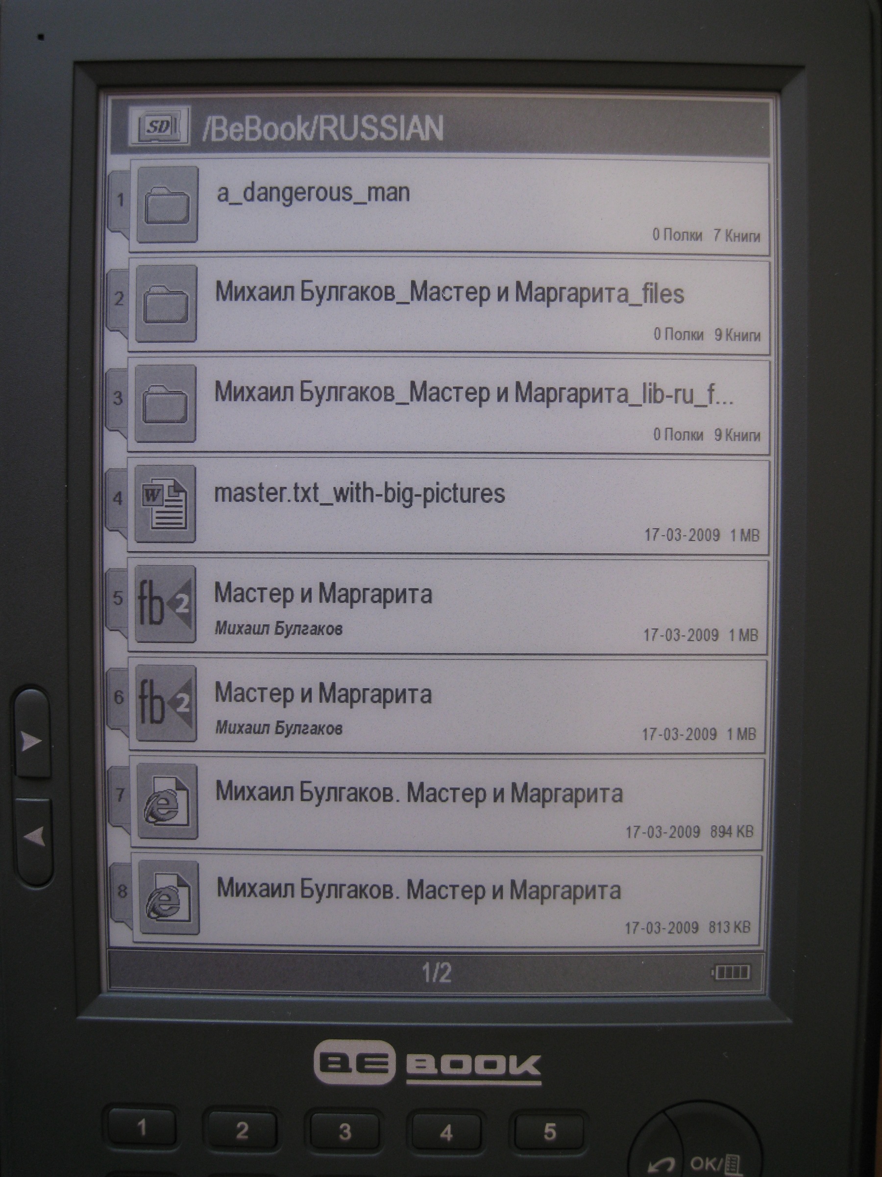Allows user fonts to be loaded on the SD card in a fonts/ folder, so you can load various cyrillic fonts to choose from. Also the language settings allow you to set the device to Russian, so all menus/commands/screens are in Russian. And the BeBook supports FB2 which is popular for Russian eBooks, as well as a multitude of other formats (Mobi, Lit, Txt, Doc, HTML/CHM, PDF, etc.). If you have some docs you'd like tested on the BeBook, upload them and I can display them on my device and take some pics if you want to check out the Russian text. Cheers. |