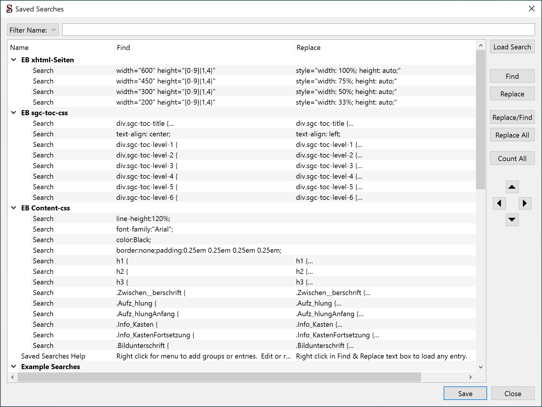 It now works great and will save me a lot of time in the future! I still need a checklist to edit my EPUBs because I need to do three separate runs of 'saved searches' for different kinds of files and with different Regex/Normal and AllFiles/CurrentFile settings. There are also some more things to do that can't be part of find&replace operations (like adding an HTML TOC, adding a cover, editing metadata). But these things are quickly done (unlike a long list of manual replace operations). So I'm very happy with what I learned in this thread.
